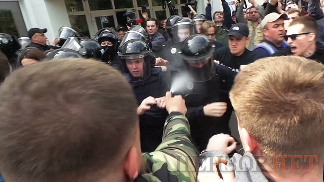 Вместе с тем, попытки намотать на столбы возле здания МВД предупреждающую ленту были пресечены правоохранителями. В результате между митингующими и правоохранителями возникла потасовка. В ходе потасовки был распылен слезоточивый или перцовый газ.