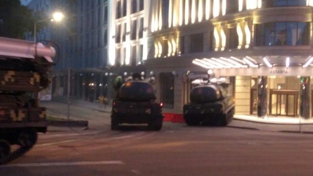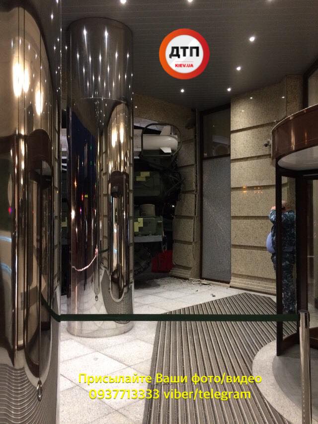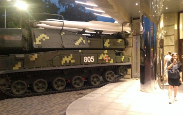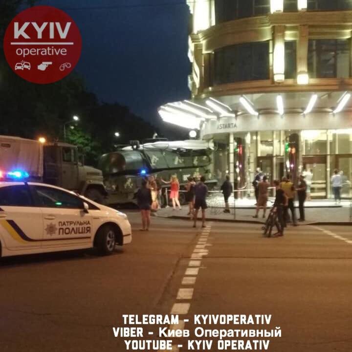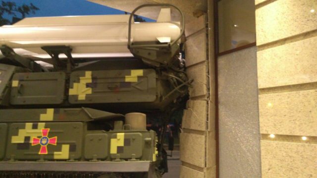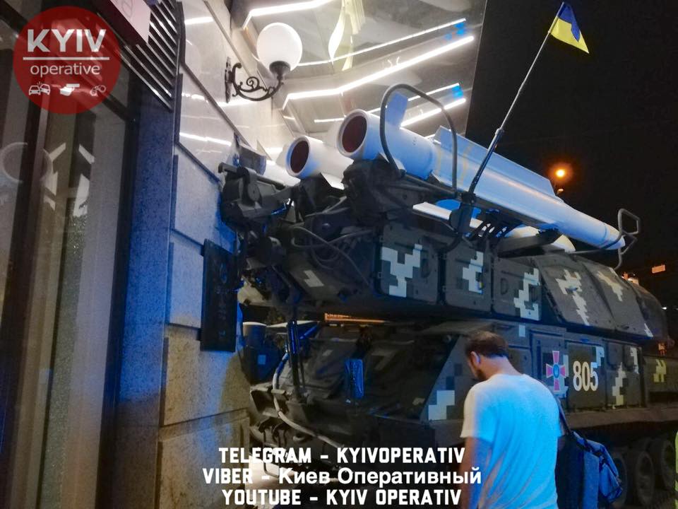 Одна из зенитных ракетных комплексов "Бук", которая участвовала в репетиции парада ко Дню Независимости Украины, врезалась в витрину Бизнес-центра на Подоле.