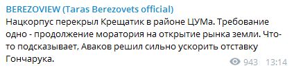"Нацкорпус перекрыл Крещатик в районе ЦУМа. Требование одно - продолжение моратория на открытие рынка земли. Что-то подсказывает, Аваков решил сильно ускорить отставку Гончарука", - написал Березовец.