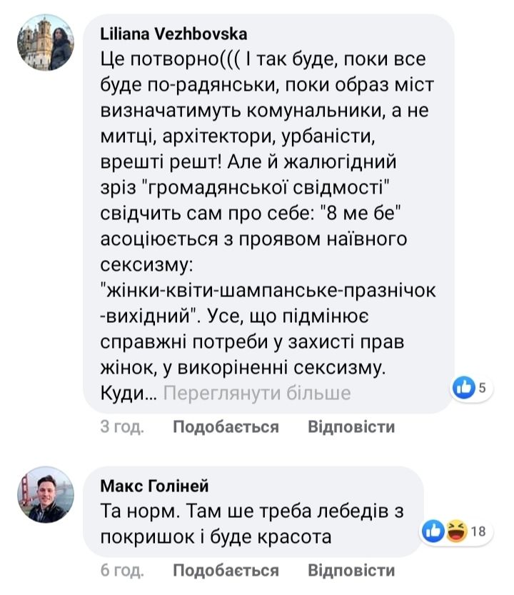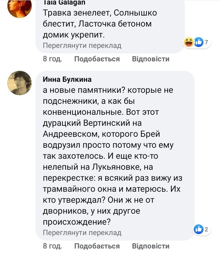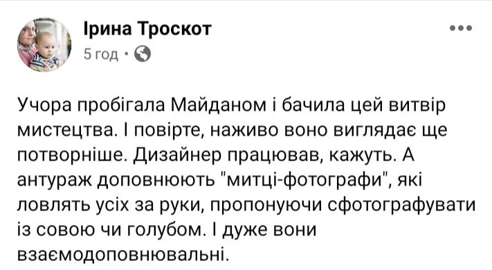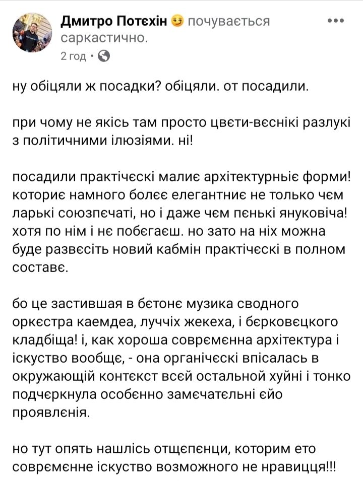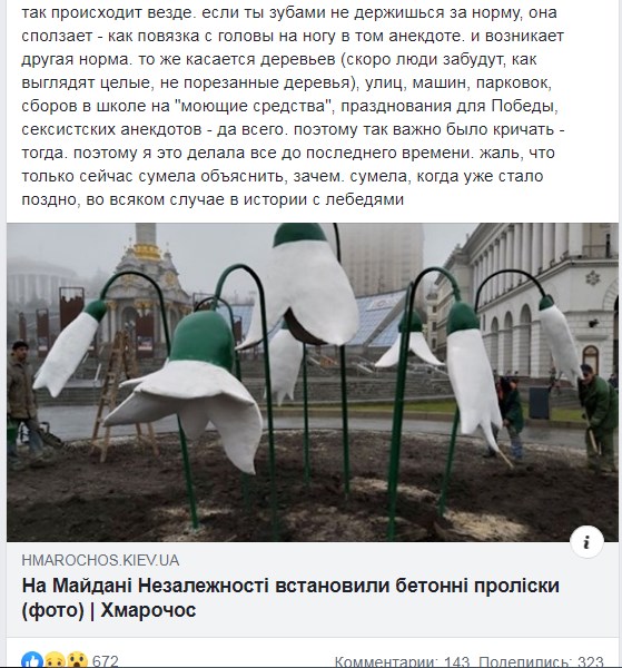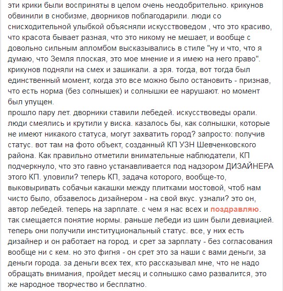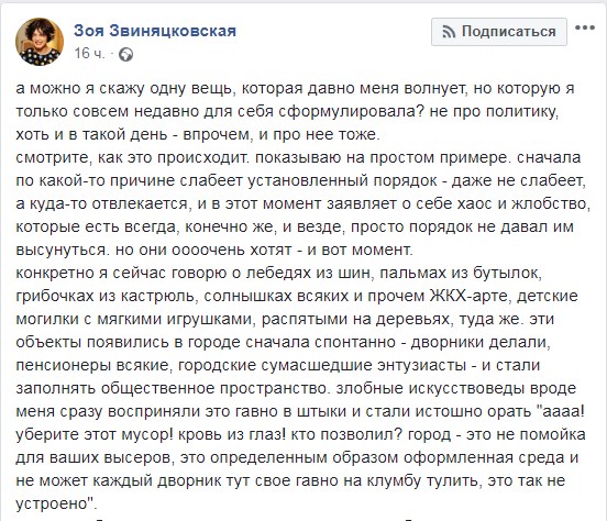 "Раньше лебеди из шин были девиацией. Теперь они получили институциональный статус. Все, у них есть дизайнер и он работает на город. И *рет за зарплату - без согласования вообще ни с кем. Но это фигня - он *рет это за наши с вами деньги, за деньги города. За деньги всех тех, кто рассказывал мне, что не надо обращать внимания, пройдет месяц и солнышко само развалится, это же народное творчество и бесплатно. Так происходит везде. Если ты зубами не держишься за норму, она сползает - как повязка с головы на ногу в том анекдоте. И возникает другая норма", - написала на своей Facebook-странице Зоя Звиняцковская.