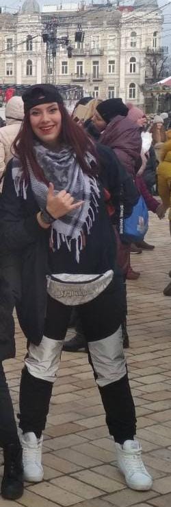 Была одета в черную куртку, черные брюки с белыми вставками на коленях и белые кроссовки.