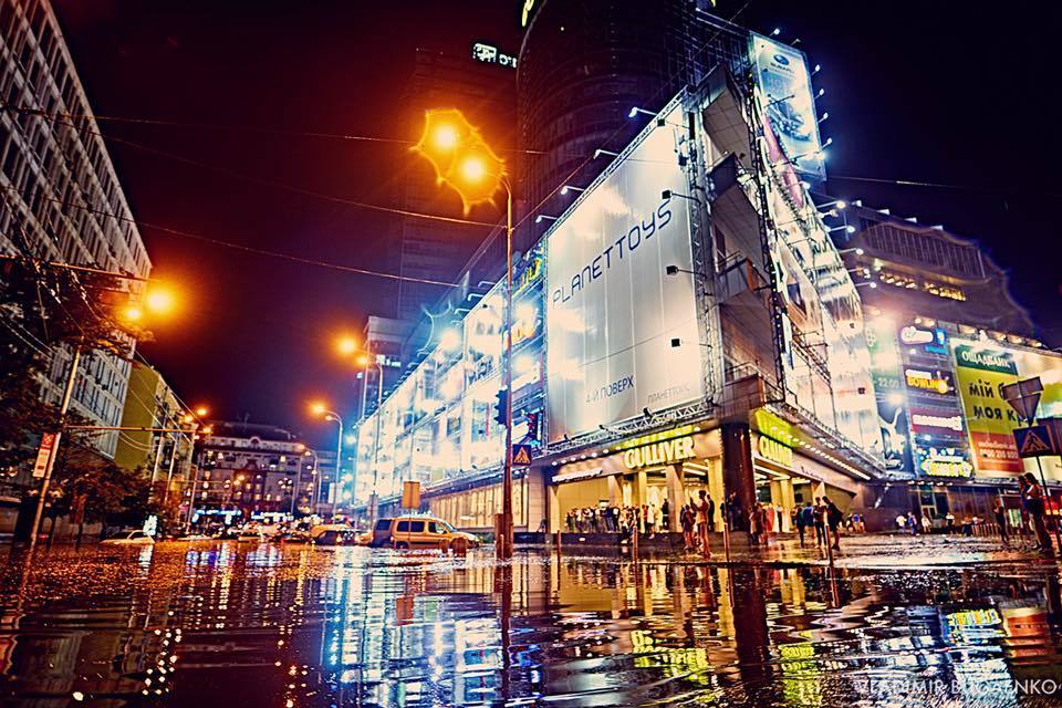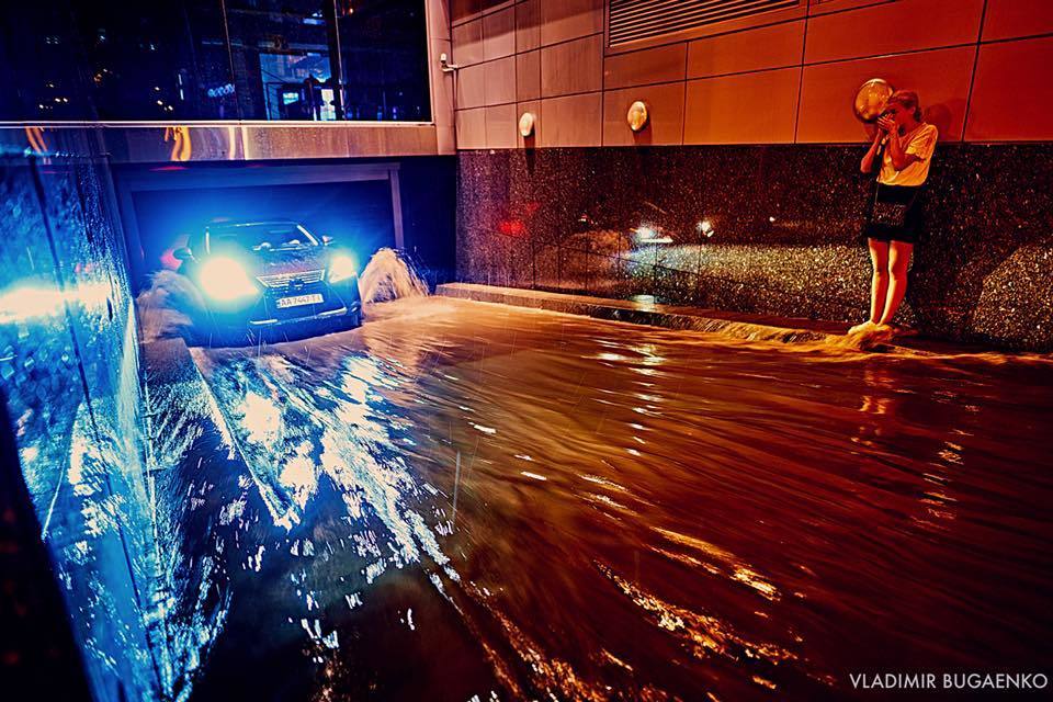 Вечерний ливень в Киеве вновь превратил улицы в реки. В некоторых частях города воды было настолько много, что она затопила припаркованные автомобили.