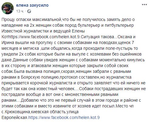 "Была вызвана полиция, скорая, женщин забрали с рваными ранами в Боярскую полицию. Протокол составлен, но журналистка прикрывается корочкой журналиста и открыто заявляет что ей ничего не будет, так как она известный человек", – написала Закусило в своем посте. Утверждается, что хозяева были недалеко и видели нападение.
