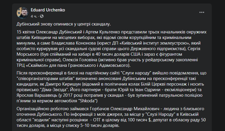 "15 апреля 2020 Александр Дубинский и Артем Культенко представили трех начальников окружных штабов Киевщины на местных выборах, а именно Владислава Кононова (юрист ГП "Киевский институт землеустройства", где лично курировал все скандальные судебные дела этого государственного предприятия), Сергея Морского (был пойман на взятке в 40 000 долларов США и сейчас является фигурантом уголовного дела) и Алексея Головина (активно участвовал в рейдерском захвате ТРЦ "Скаймол" для господина Грановского и Адамовского), которые известны своим коррупционным и уголовным прошлым", - пишет Юрченко.