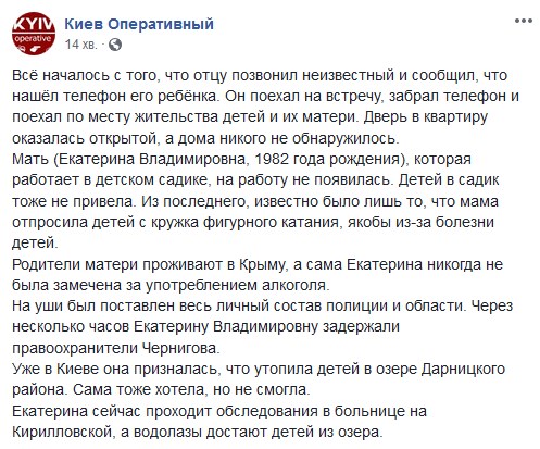 Женщину задержали в Черниговской области и доставили в Дарницкое управления полиции. Она путалась в показаниях, но рассказала, что дети пошли купаться на озеро "Серебряный Кол". Полиция выехала на место к водоему в Дарницком районе столицы по адресу улица Срибнокильская, 14-16. Там в трех метрах от берега на глубине 1 метр обнаружили тела мальчика и девочки, они были утоплены в озере.