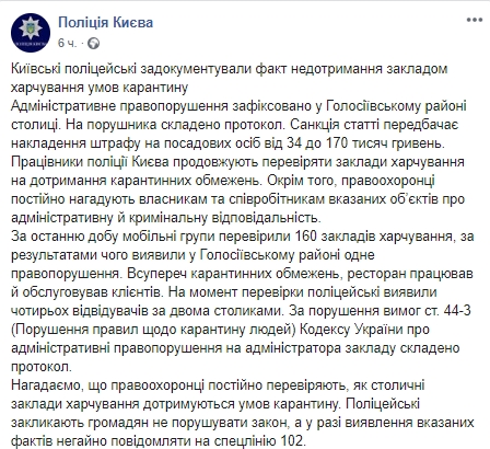 В Голосеевском районе Киева полицейские выявили ресторан, который работал вопреки карантинным ограничениям.