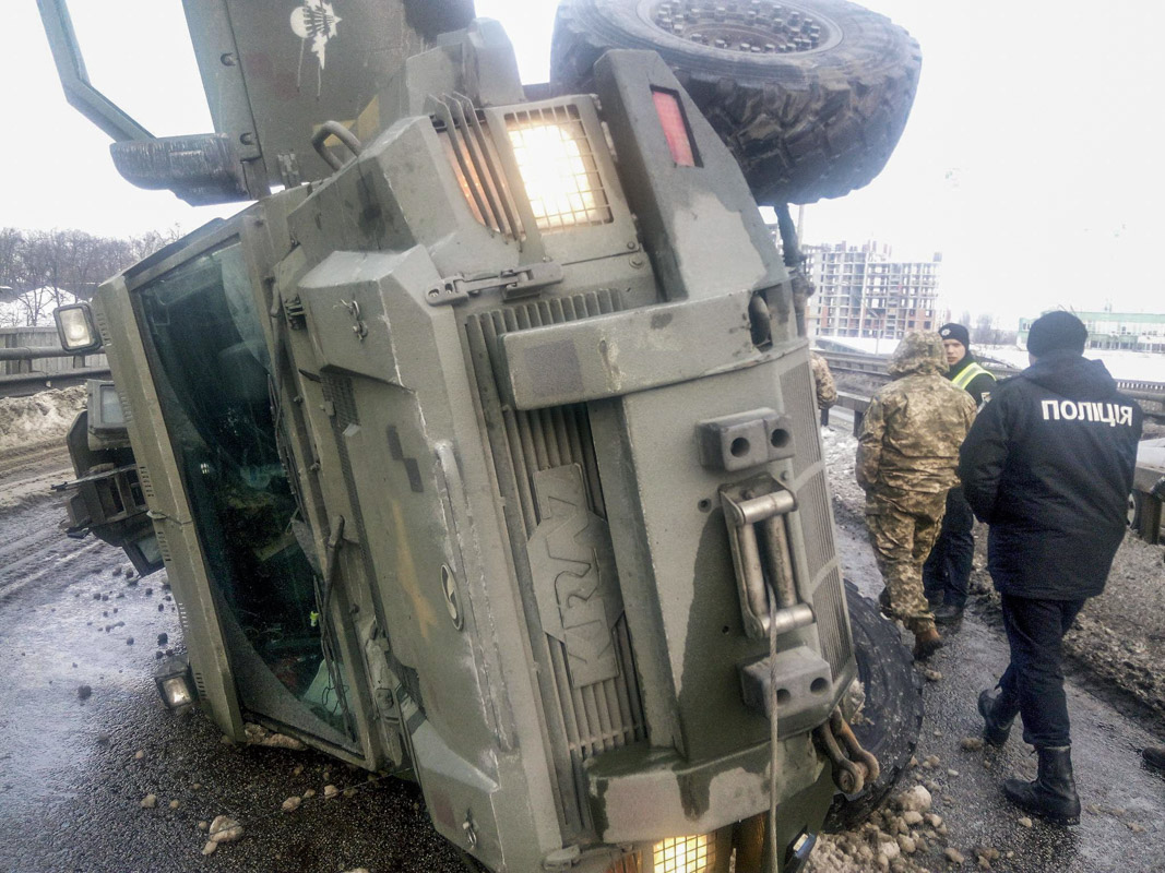 Появились новые фотографии с места дорожно-транспортного происшествия с военным бронеавтомобилем Cougar, который перевернулся в Киеве в районе станции метро "Нивки".