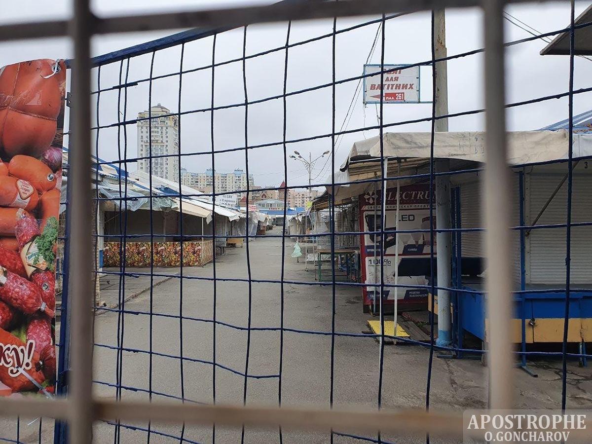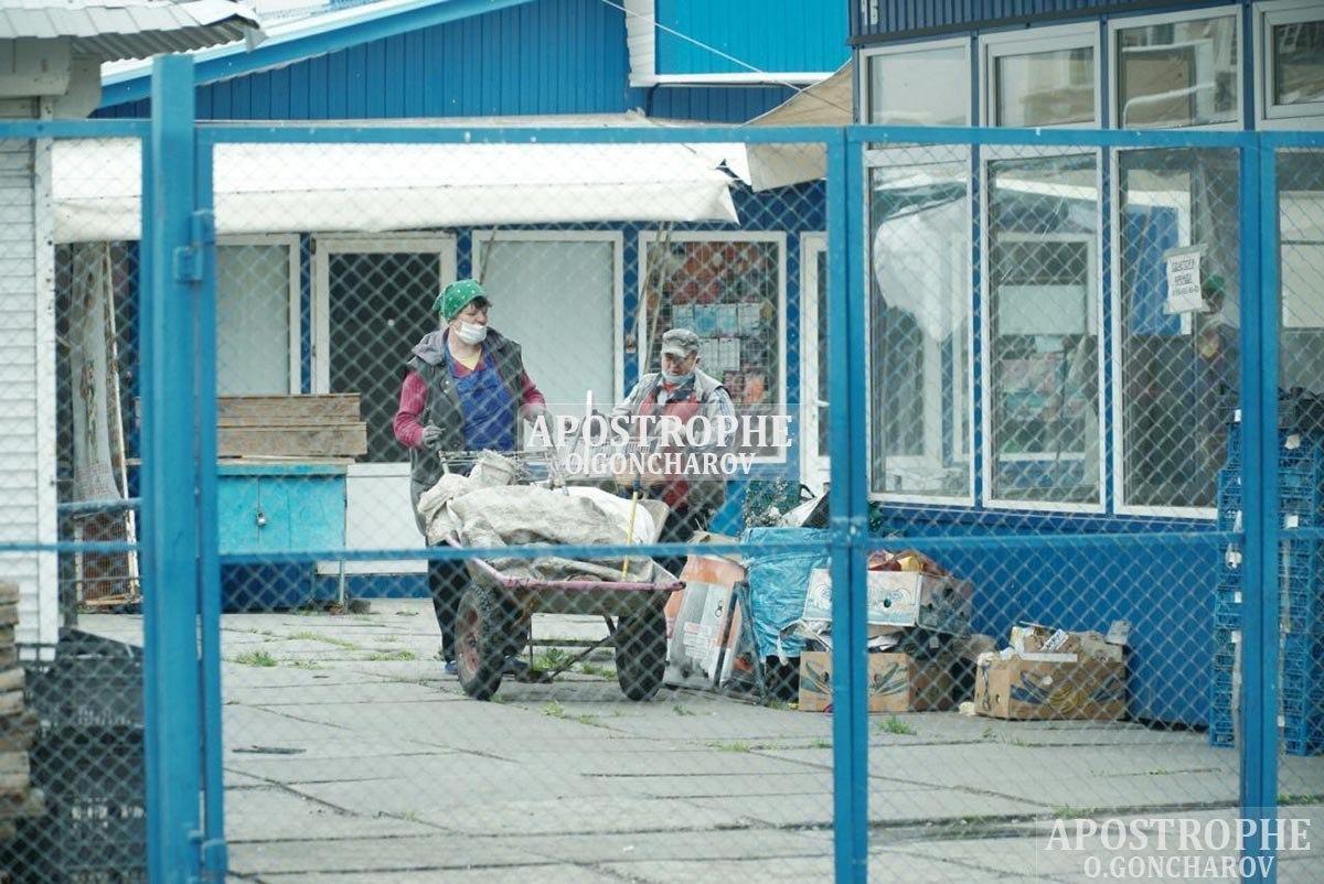 На рынке на улице Героев Днепра также бойкая торговля не ведется. Ворота закрыты, павильоны не работают, на территории видно только подсобных рабочих, которые занимаются уборкой.