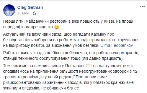 Как пишет Гетман, цель акции - напомнить Кабмину о безосновательности запрета на работу заведений общественного питания на открытом воздухе, за выполнение условий безопасности. Он подчеркнул, что работа таких учреждений не более опасна, чем работа супермаркетов, станций технического обслуживания и т.д. (которые давно работают).