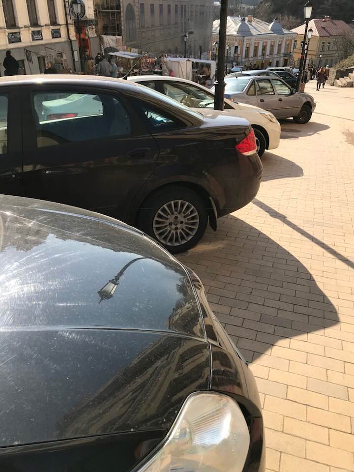 Пользователей социальных сетей возмутила стихийная парковка, которая образовалась на Андреевском спуске после уборки МАФов с сувенирами.
