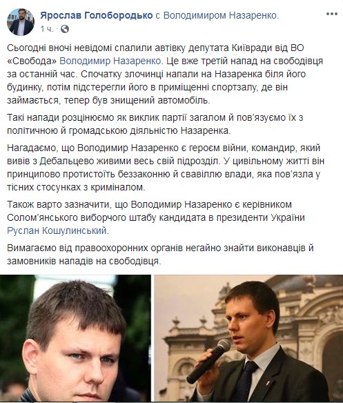 "Это уже третье нападение на свободовца за последнее время. Сначала преступники напали на Назаренко возле его дома, потом подстерегли его в помещении спортзала, где он занимается, теперь был уничтожен автомобиль", - написал в Facebook его соратник Ярослав Голобородько.
