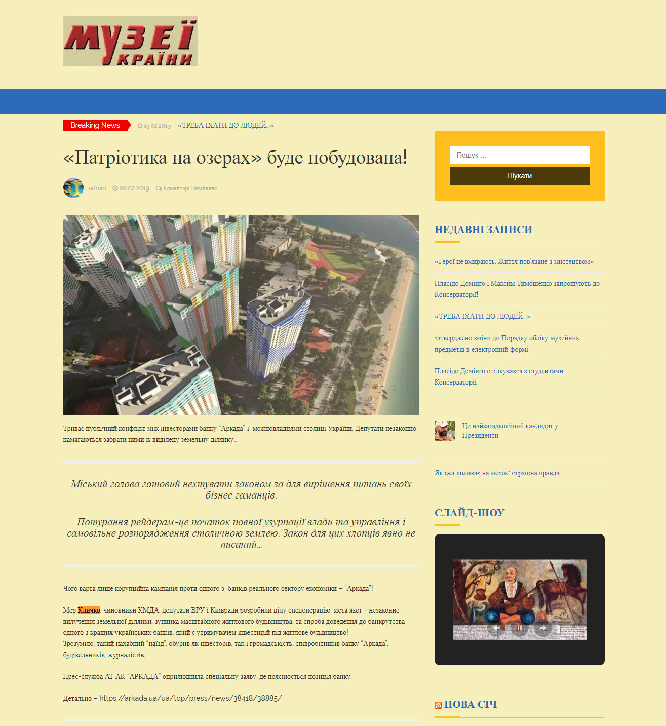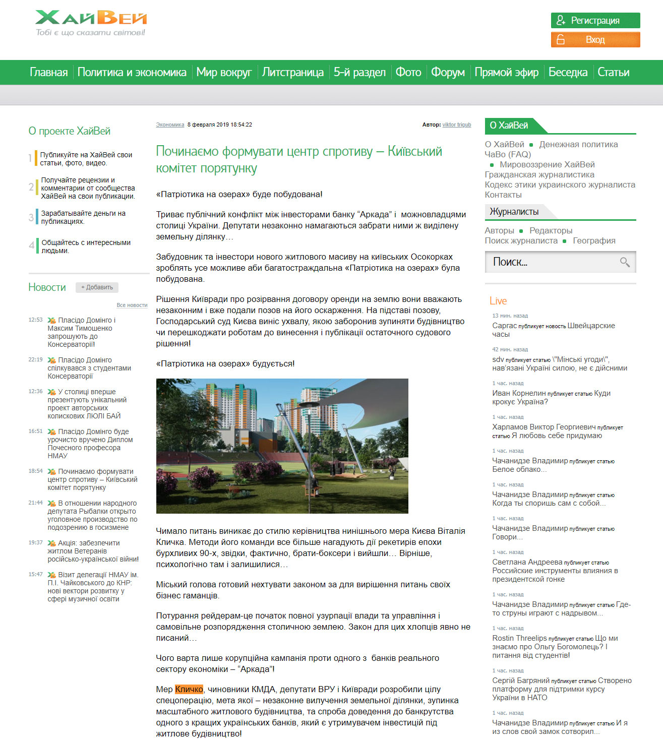 Он напомнил, что Киевсовет разорвал договор об аренде земельного участка из-за долга в десятки миллионов гривен и возмущений местных жителей, которые выступили против строительства жилищного комплекса на заповедных озерах.