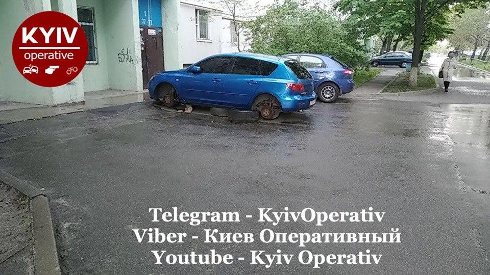 На снимках видно, что с автомобиля сняли все четыре колеса. Также стоит отметить, что автомобиль оказался на иностранной регистрации, на что обратили внимание в комментариях.