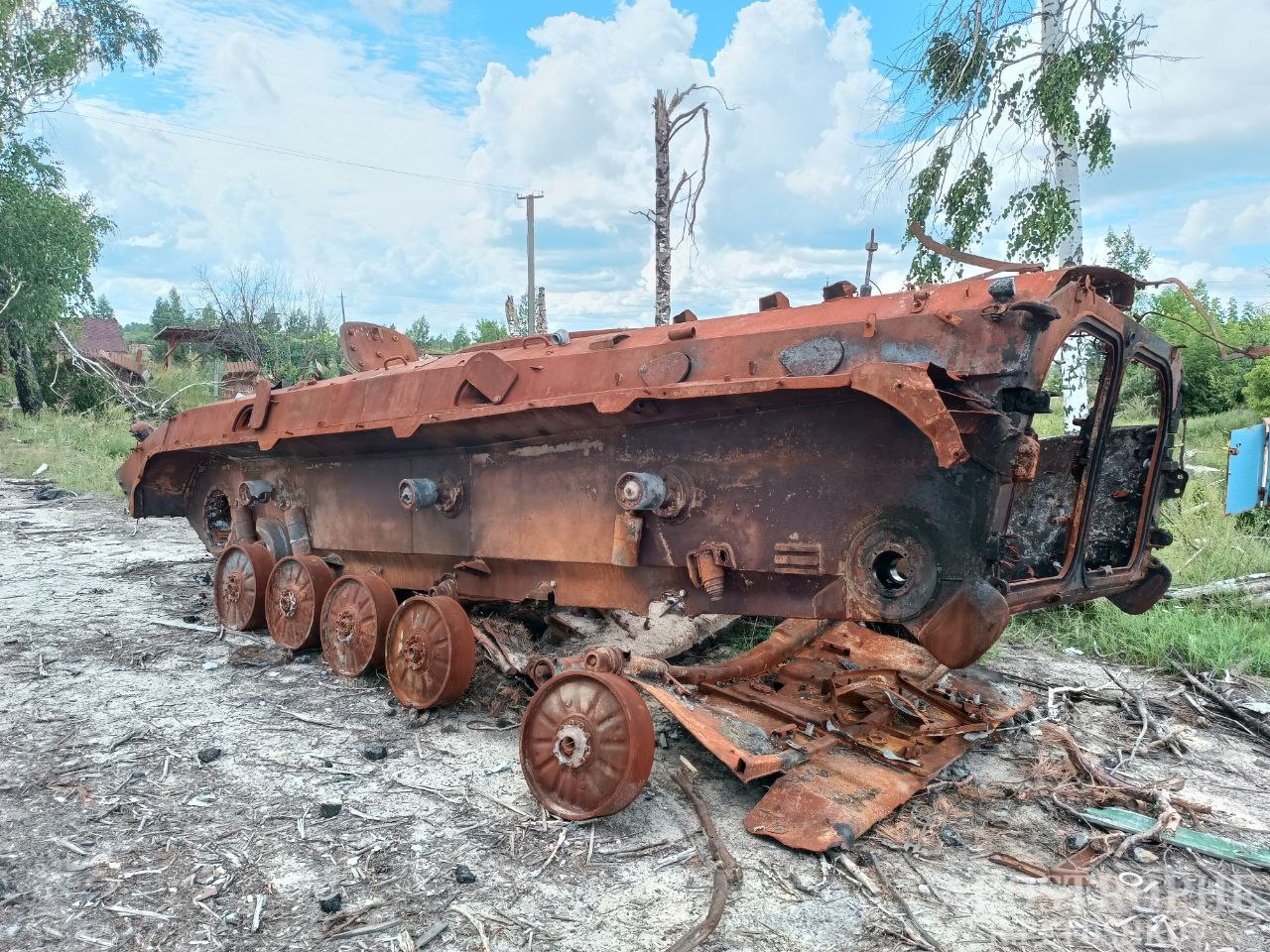 Также местные жители рассказали о боях ВСУ с российским оккупационным войском: украинские военные уничтожили колонну вражеских БТРов вблизи села – теперь сожженную российскую технику порежут на металл.
