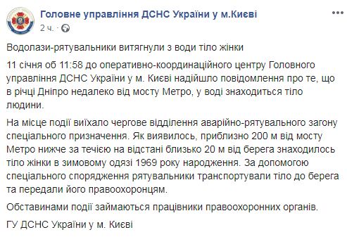 С Днепра недалеко от моста Метро водолазы-спасатели вытащили тело женщины