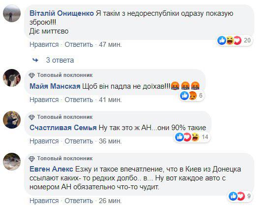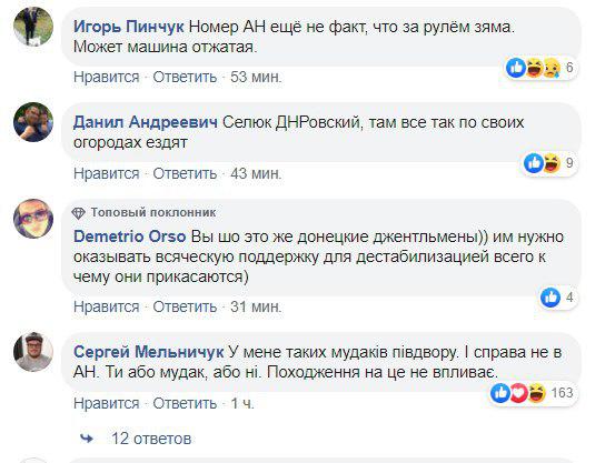 "Номера АН о многом говорят... Один из вариантов: машина двойник... Не ну и про водителя тоже", "Мажорам дойдет что нужно себя вести нормально и уважать всех участков дорожного движения только тогда, когда их привселюдно рвать начнут прям на дороге и показывать другим! Ты смотри на него! А небось если бы водила Шкоды ему отвалит норм, так первый побежал бы к куму или брату в ментовку заяву писать", "По номерам все понятно... к сожалению с номерами АН я встречаю постоянно хамство. Вот буквально на прошлых выходных", "Селюк ДНРовский, там все так по своих огородах ездят", - пишут в комментариях.