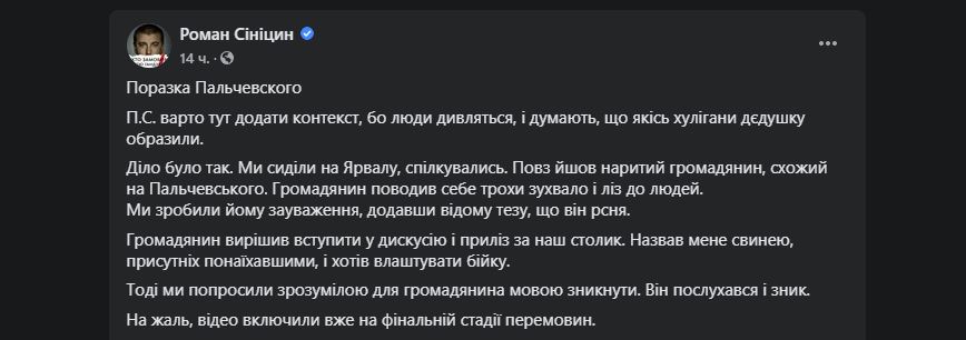 "Поражение Пальчевского. Стоит здесь добавить контекст, потому что люди смотрят, и думают, что какие-то хулиганы дедушку обидели. Дело было так. Мы сидели на Ярвалу, общались. Мимо шел нарыть гражданин, похожий на Пальчевского. Гражданин вел себя немного дерзко и лез к людям. Мы сделали ему замечание, добавив известный тезис, что он рсня. Гражданин решил вступить в дискуссию и приполз за наш столик. Назвал меня свиньей, присутствующих понаехавшими, и хотел устроить драку. Тогда мы попросили понятном для гражданина языке исчезнуть. Он послушался и исчез. К сожалению, видео включили уже на финальной стадии переговоров", – написал волонтер Роман Синицын.