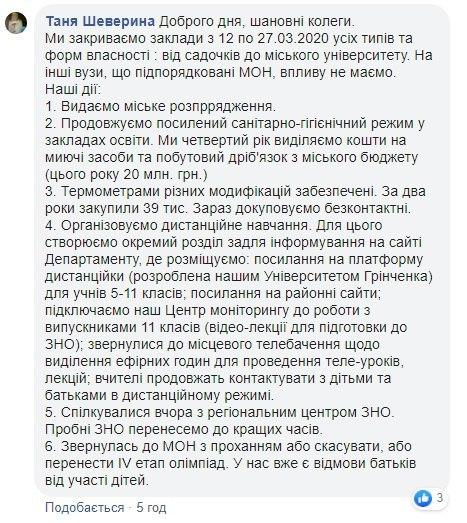 Как сообщал "Апостроф", после объявленного карантина в связи угрозой распространения коронавируса Covid-19 в школах Киева оперативно расклеили объявления о приостановке образовательного процесса.