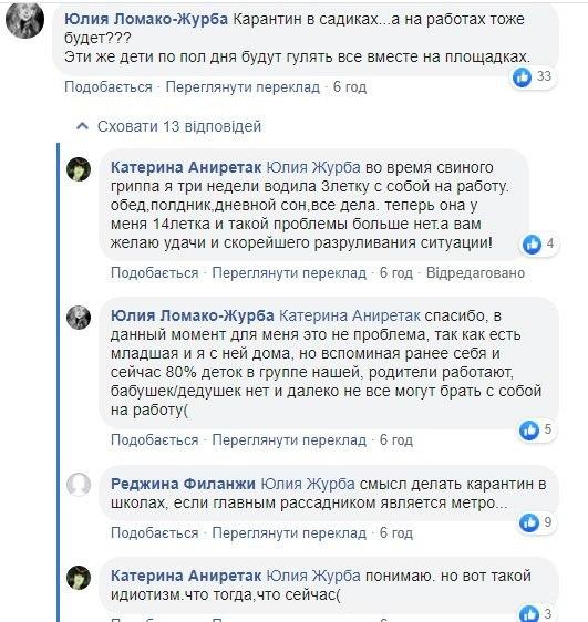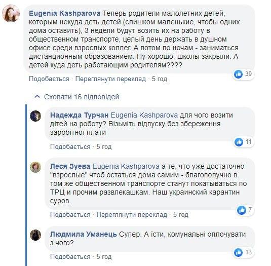 Решение киевской власти родители критикуют за то, что, по их мнению, карантин в школах и садиках не даст положительного профилактического эффекта, поскольку дети, оставшись без присмотра родителей, все равно будут посещать места массового скопления людей – в торгово-развлекательных центрах, на детских площадках и в транспорте.