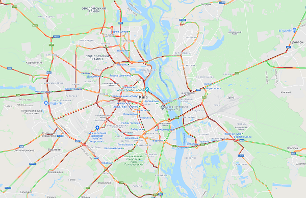 По состоянию на 9:30 значительно затруднено движение почти всеми основными магистралями столицы: в пробках стоят Северный и Южный мосты, проспект Победы, проспект Академика Глушкова по направлению к центру города, традиционно в пробке стоят автомобили в центре, затруднено движение транспорт в районе станций метро "Лукьяновская" и "Шулявская".
