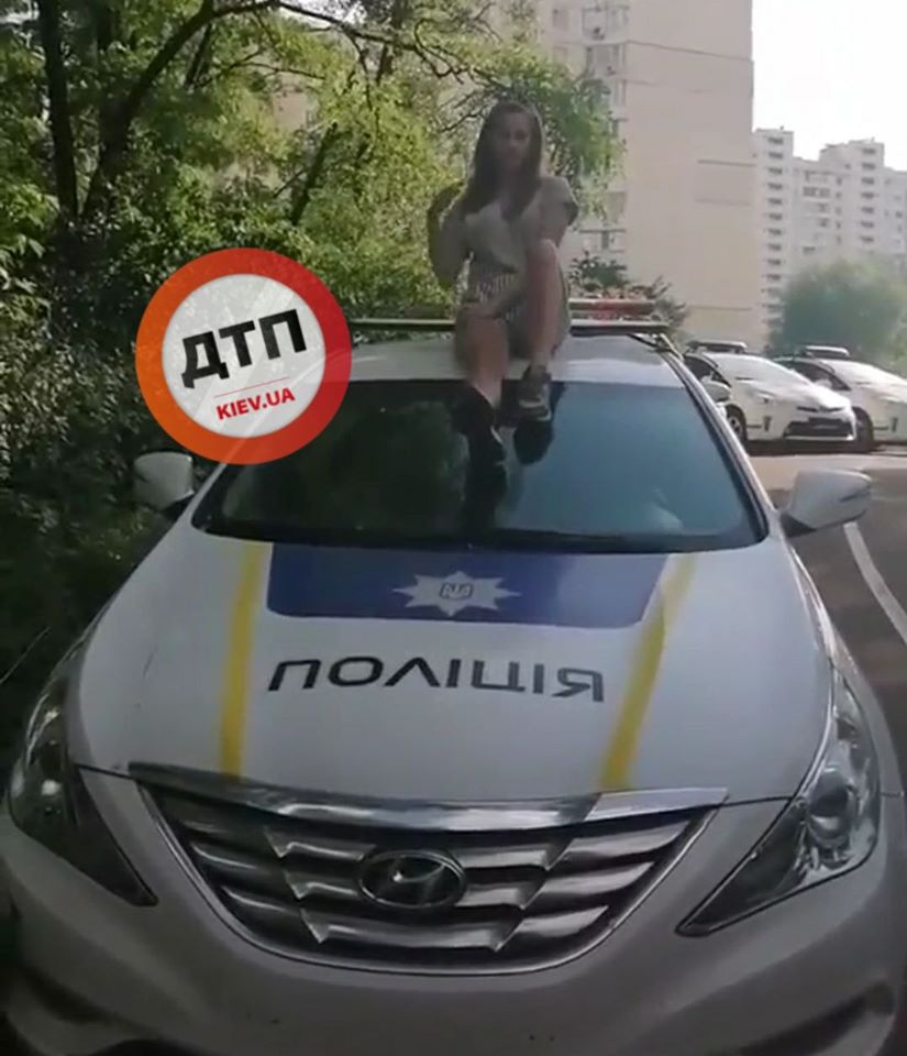 В Киеве девушка залезла на крышу полицейского автомобиля.