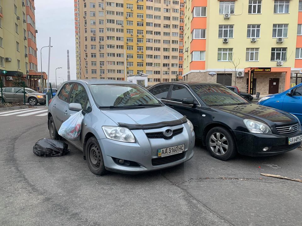 На снимках можно заметить, что автомобиль припаркован во втором ряду на въезде в жилой комплекс. На его зеркале бокового вида и рядом оставили пакеты, по всей видимости, с мусором.