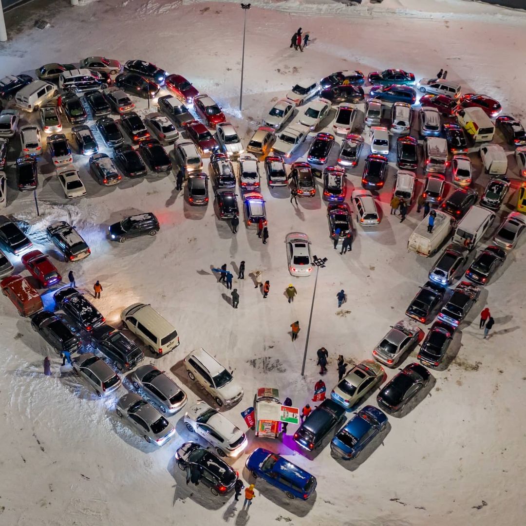Автомобильную валентинку выстраивали на парковке возле торгово-развлекательного центра Блокбастер. Над созданием трудилась большая команда автолюбителей, специалистов со школы пилотирования, фотографы и видеографы.
