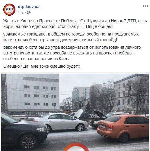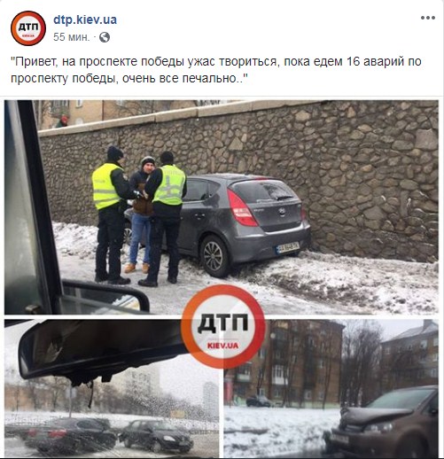 Отмечается, что на отрезке между станциями метро "Шулявская" и "Нивки" произошли, как минимум, 7 ДТП. В общей сложности на проспекте - более десятка аварий.