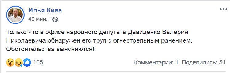 В пятницу, 23 мая, был найден труп народного депутата Украины Валерия Давыденко в его же офисе.