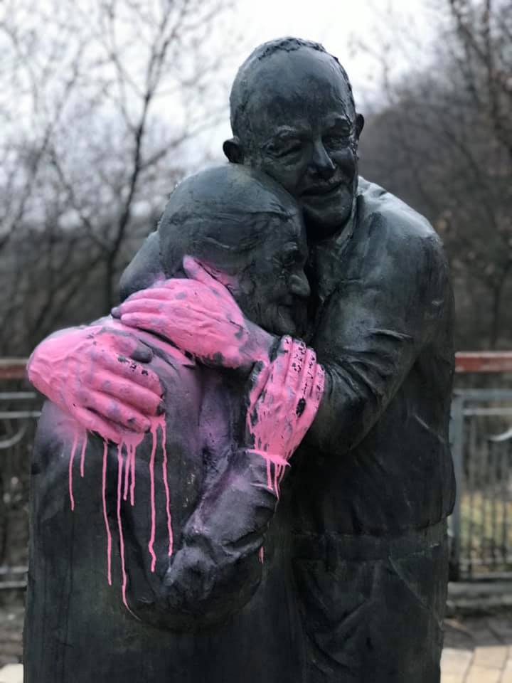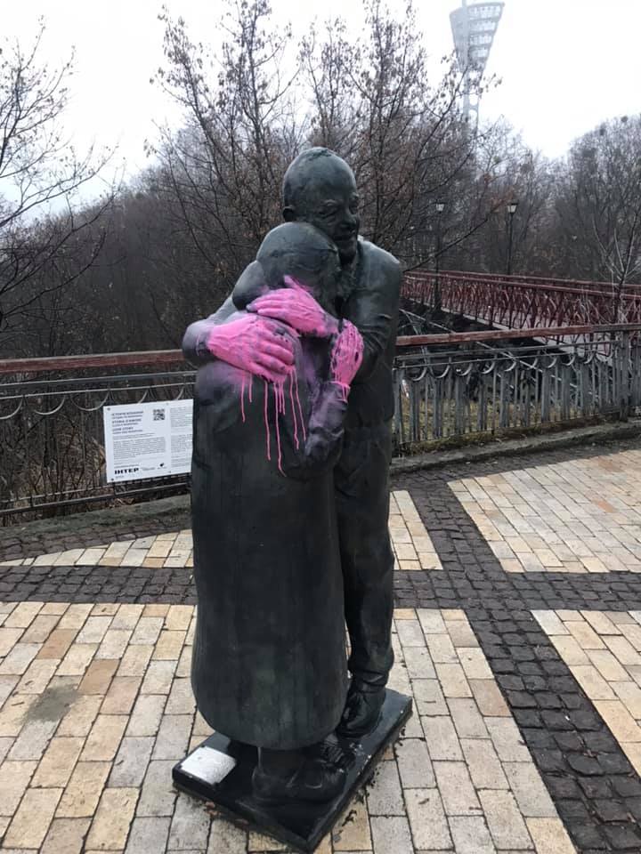 В Киеве вандалы облили краской известный памятник влюбленной паре.