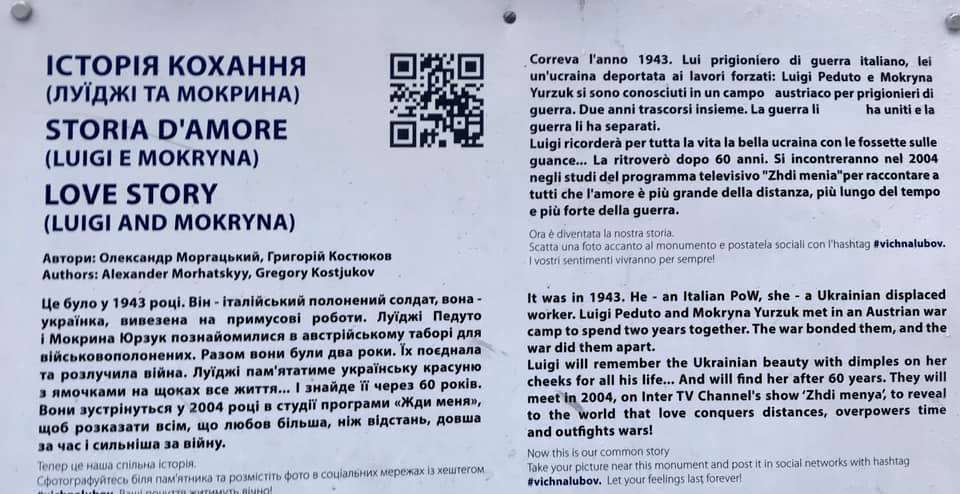 Скульптура под названием "История любви" посвящена невероятной истории любви итальянца и украинки, которые потеряли друг друга на войне и встретились спустя 60 лет. Ее открыли на мосту влюбленных в 2013 году.