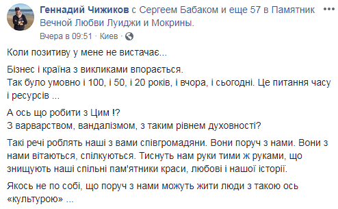"Такие вещи делают наши с вами сограждане. Они рядом с нами. Они с нами приветствуются, общаются. Пожимают нам руки теми же руками, уничтожая наши совместные памятники красоты, любви и нашей истории", - написал он и опубликовал фото.