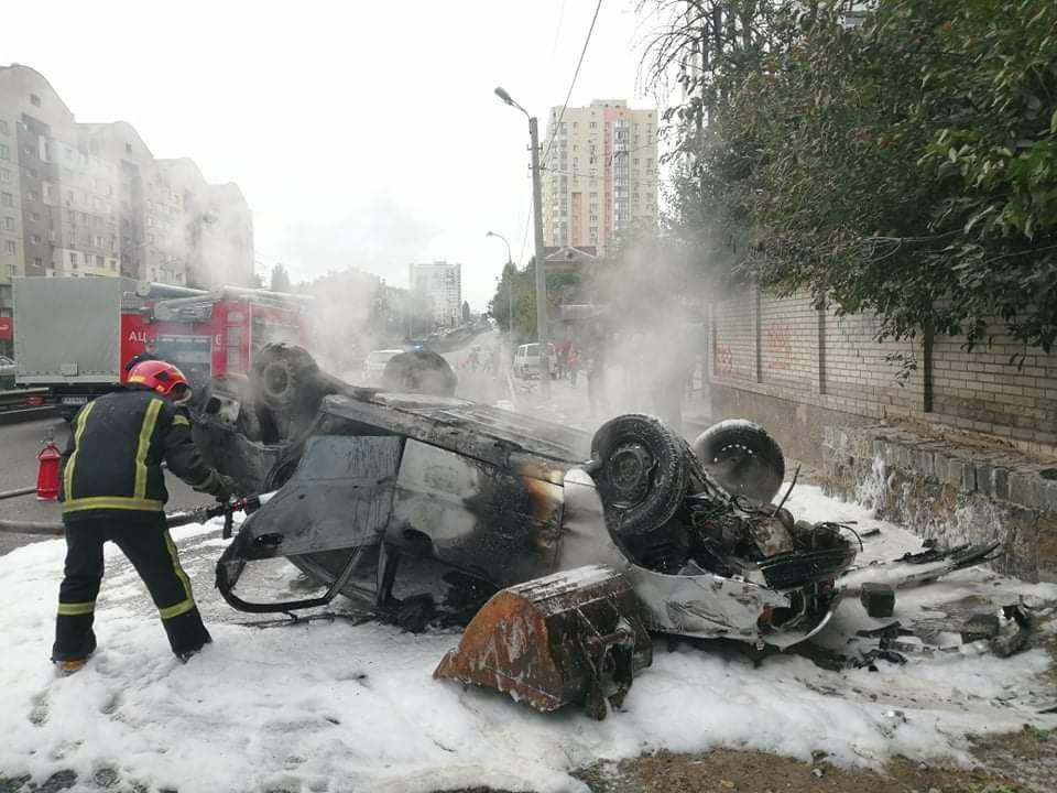 В пятницу, 16 октября, на улице Борщаговской в Киеве автомобиль Daewoo Lanos, столкнувшись с Chevrolet Aveo, опрокинулся на крышу и загорелся. Водителя спасли очевидцы ДТП.