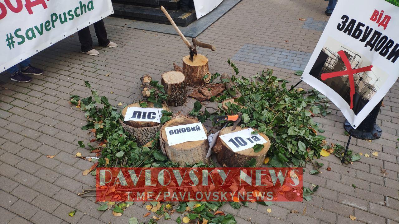 По словам митингующих, незаконная вырубка леса в Пуще-Водице началась в 2007-09 годах, но тогда на земли был наложен арест. Сейчас он снят.