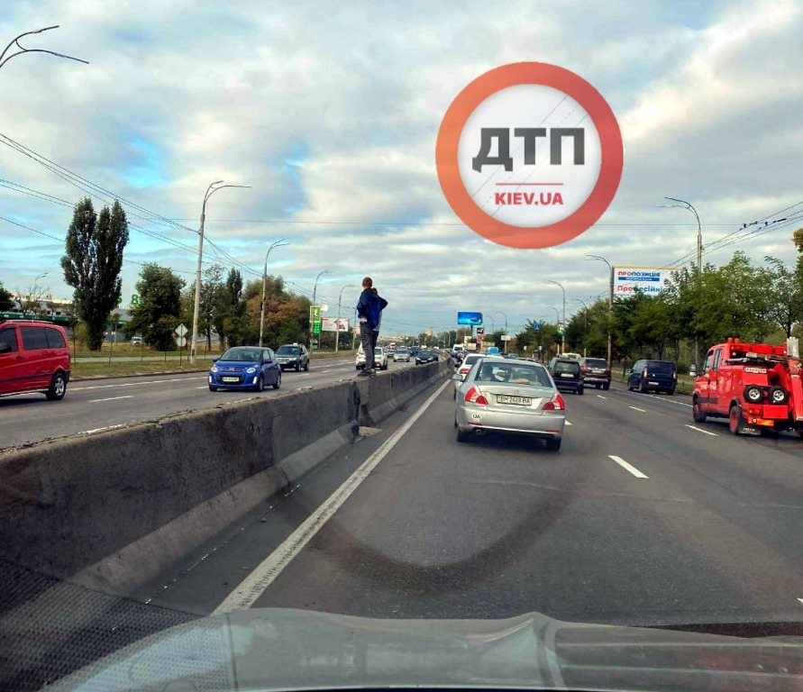 Парни стояли на отбойнике посреди трассы, которая разделена на четыре полосы в каждую сторону. Они перебежали одну часть дороги и ждали удобного момента, чтобы проскочить между авто на другую сторону.