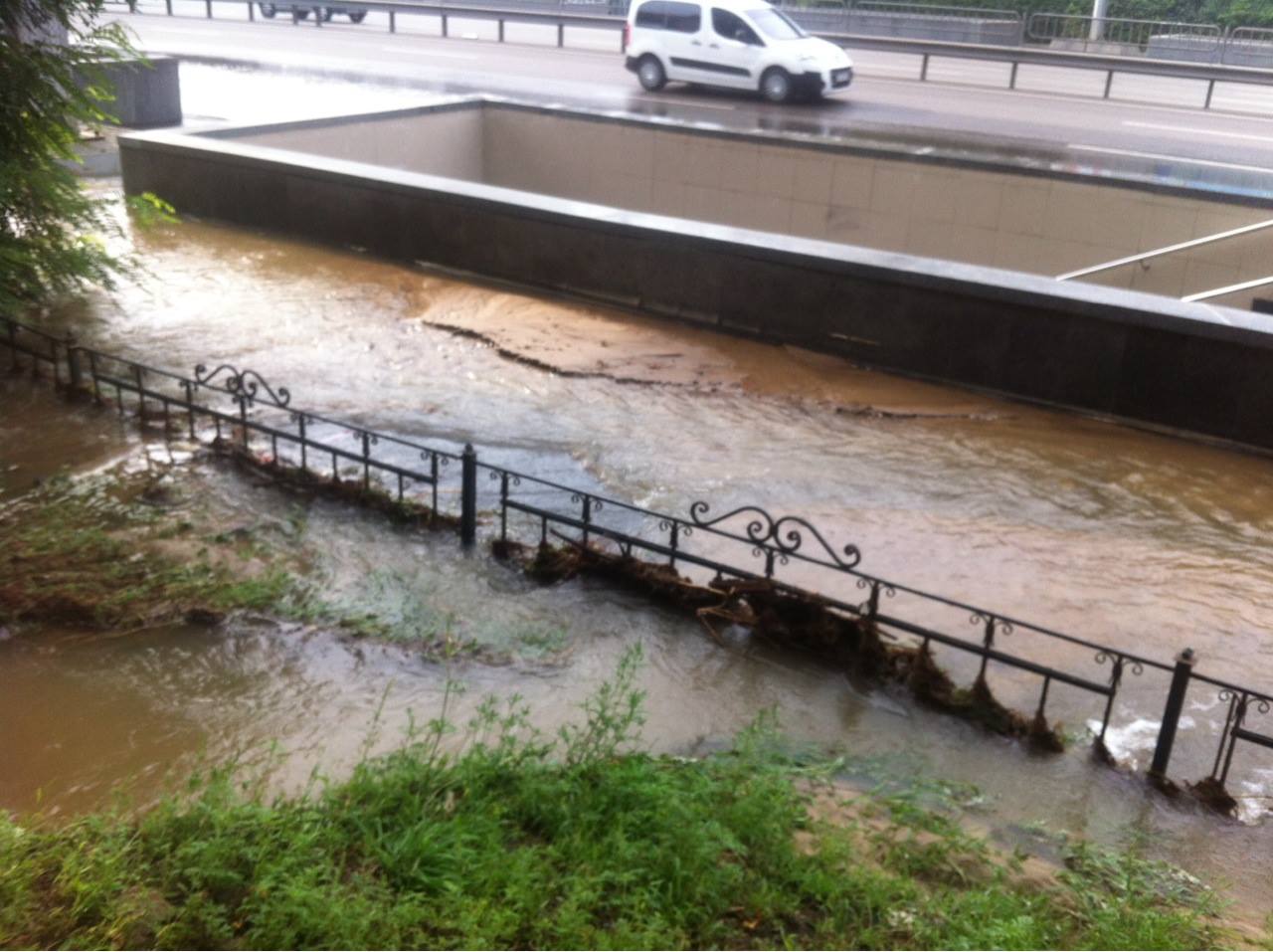 На фото и видео видно, что из-за сильного потока воды затруднено движение на проезжей части.