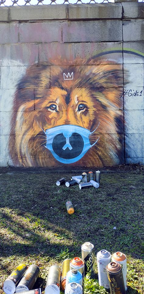 Мурал, на котором изображен лев в маске и с короной на голове, можно увидеть, если пройтись от станции метро "Днепр" в сторону моста Патона (ближе к мосту Метро).