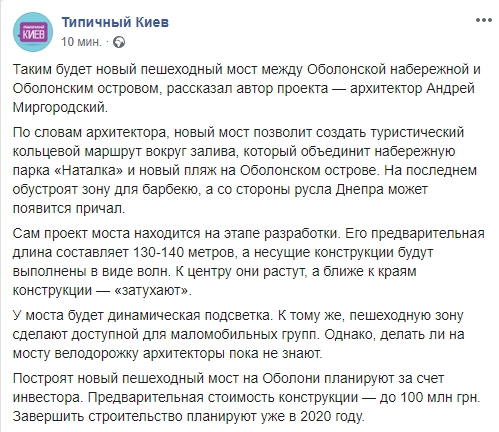 Построить новый пешеходный мост на Оболони планируют за счет инвестора. Предварительная стоимость конструкции – до 100 млн грн. Завершить строительство планируют уже в 2020 году.