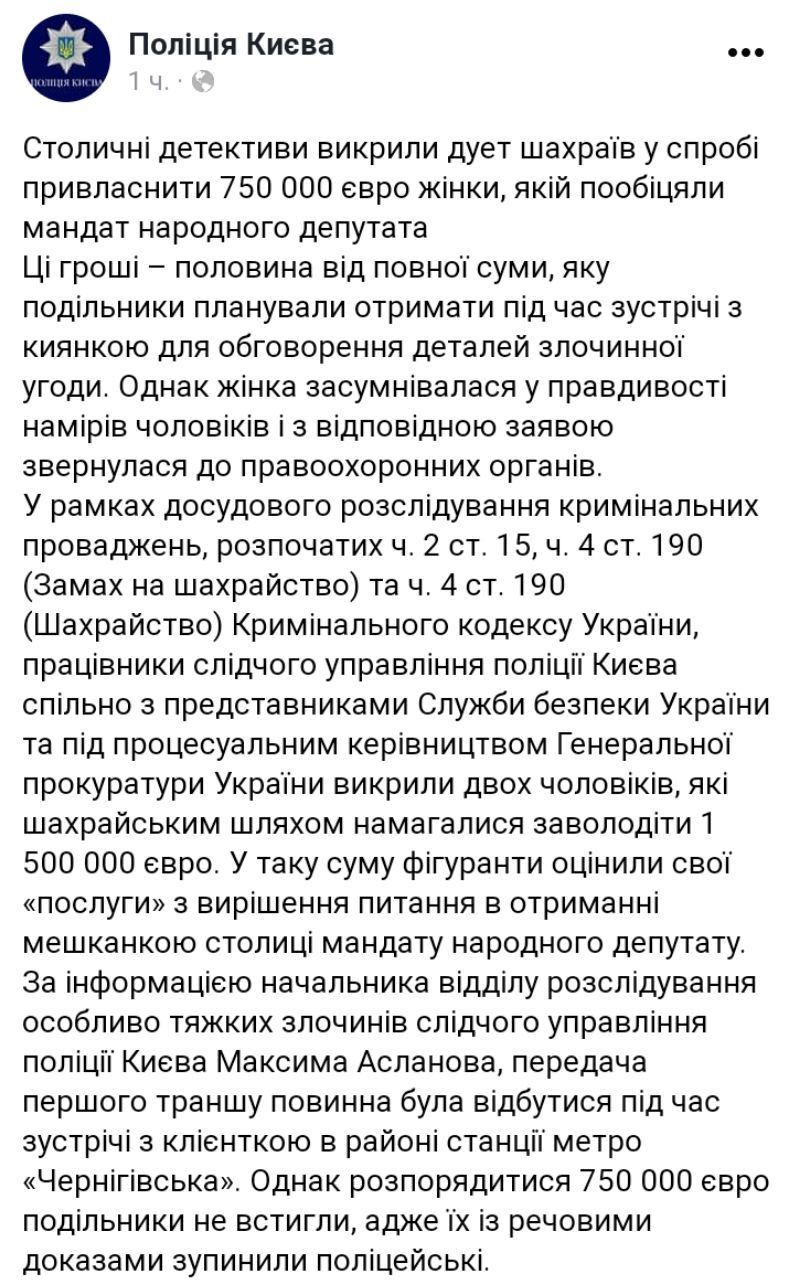 68-летний киевлянин и его 46-летний подельник пообещали женщине посодействовать в получении удостоверения народного депутата. За свои услуги потребовали 150 тысяч евро. Половину сказали принести в указанное время на станцию метро "Черниговская". Женщина обратилась в полицию, которая вместе с сотрудниками СБУ задержала злоумышленников.