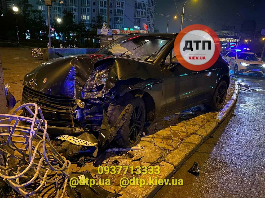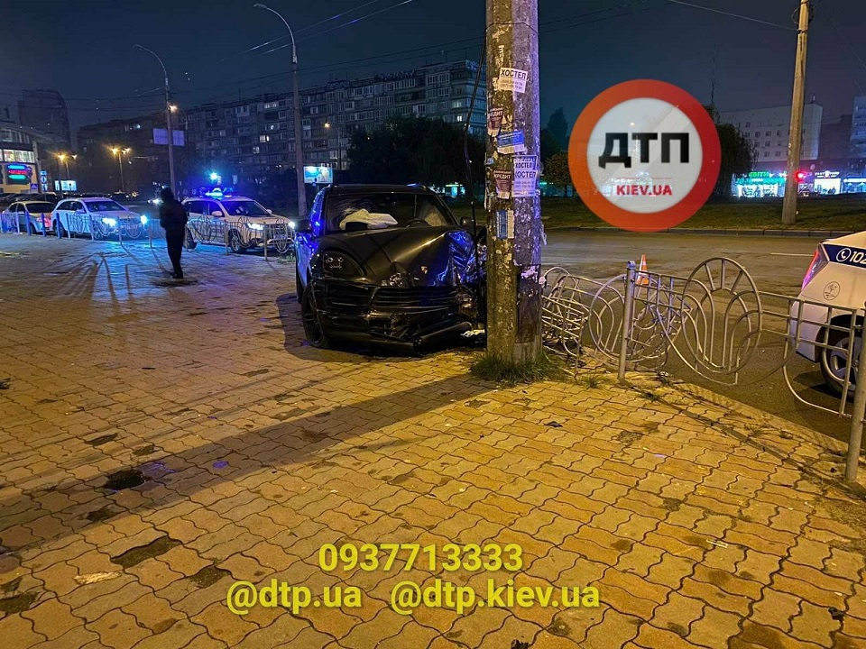 В Оболонском районе Киева водитель Porsche, не справившись с управлением, выехал на тротуар, где врезался в электроопору. По словам, очевидцев водитель был пьян, но вину за устроенное ДТП попыталась взять на себя его девушка.