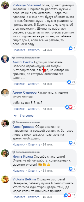 "Блин, до чего доводит карантин.. Родителям работать нужно и ребенка не с кем оставить... Карантин сделали, а с кем дети будут об этом никто не позаботился,думать нужно родителям прежде всего. В Европе хоть чуть чуть об этом подумали . Школы не работают совсем, а сады частично, то есть если кто то из родителей не работает, то ребенок сидит дома, если все на работе, то ребенок в саду", "Страшно смотреть! Наверное, ребенку лучше б было кричать что-то типа Иди открой дверь, там Дед мороз какой-то или мама пришла", "Спасибо спасателям! Очень не легкая работа, сопряженная с высоким риском", - пишут в комментариях.