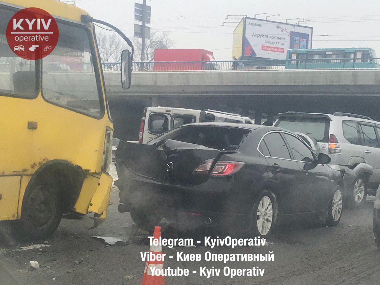 28 января в районе Святошино в Киеве произошла масштабная авария: столкнулись три автомобиля, в том числе и маршрутное средство с пассажирами.