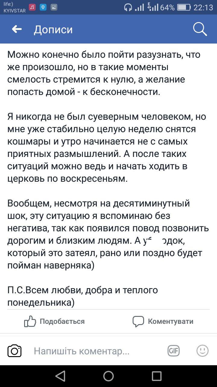"Транспорт остановился, все начали выбегать, толкотня, паника. И только мужичок, который сидел прям в эпицентре случившегося никак не мог приподняться. Пару сантиметров ниже и он бы уже не попал домой, метр левее и я этот пост не писал бы", - говорится в сообщении.