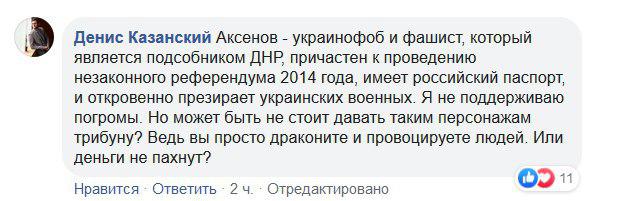 "У нас какие-то неадекват - титушки в эти дни постоянно на Левобережке бродят", "Нападение на журналистов в центре столицы в Государственном "Укринформе" Такого еще видимо не было....", "Интересно, отреагирует на этот инцидент Президент Зеленский? он сегодня демонстрирует свое желание навести порядок в ненцы-Украина", "Аксенов - украинофоб и фашист, который является подсобником ДНР, причастен к проведению незаконного референдума 2014 года, имеет российский паспорт, и откровенно презирает украинских военных. Я не поддерживаю погромы. Но может быть не стоит давать таким персонажам трибуну? Ведь вы просто драконите и провоцируете людей. Или деньги не пахнут?", - комментируют пользователи.