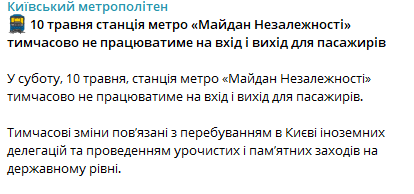 В субботу, 10 мая, в столице не будет работать одна из ключевых станций Киевского метрополитена. Речь идет о временных ограничениях в связи с торжественными мероприятиями в центре города.