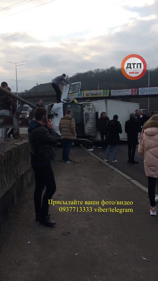 Грузовик двигался в сторону метро Выдубичи. Водитель не справился с управлением и машина перевернулась. Грузовик лег на бок, а в капот машине вонзилась металлическая труба.