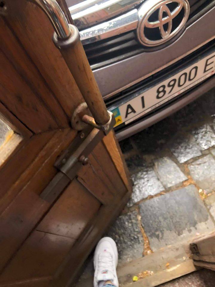 Водитель автомобиля Toyota на улице Институтской в Киеве припарковал свое транспортное средство прямо у дверей парадного подъезда, заградив вход и выход из здания.