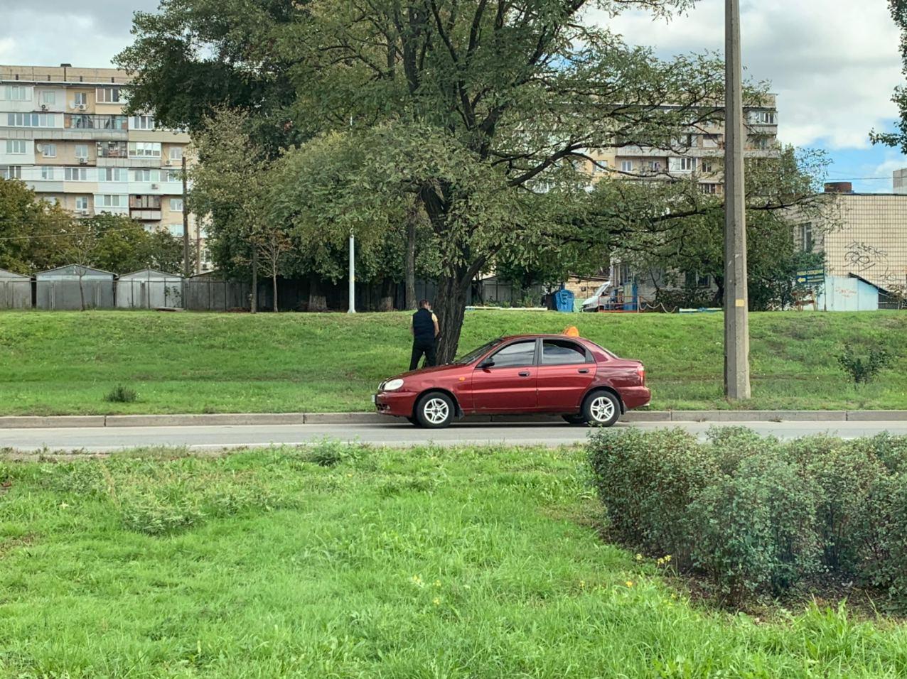 Водитель остановился среди дороги, вышел из автомобиля и решил сходить в туалет. Чтобы справить нужду, он спрятался за дерево, но прохожий смог его запечатлеть.