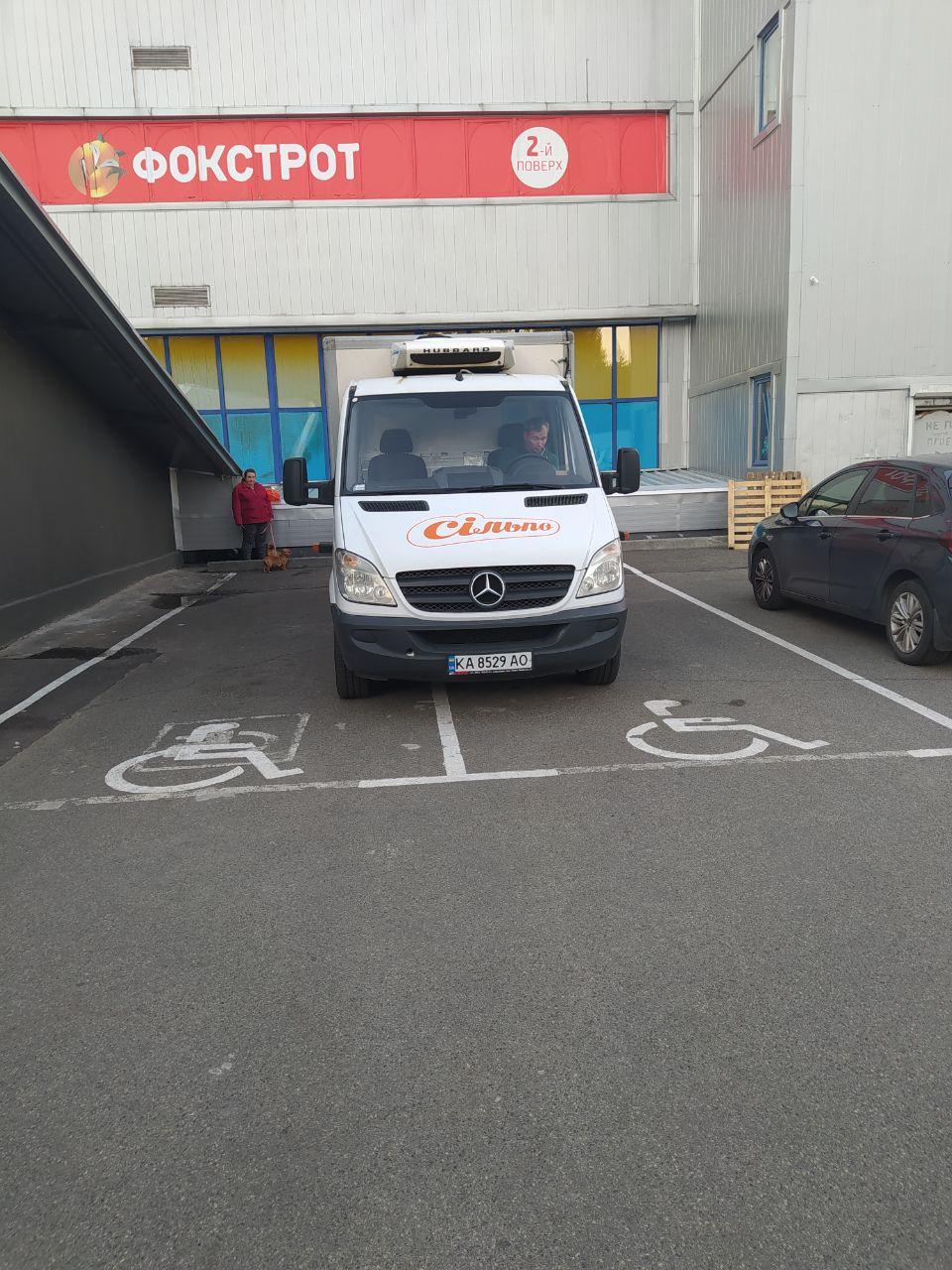 В Киеве водитель автомобиля службы доставки сети супермаркетов "Сильпо" припарковался так, что занял сразу два парковочных места для инвалидов.