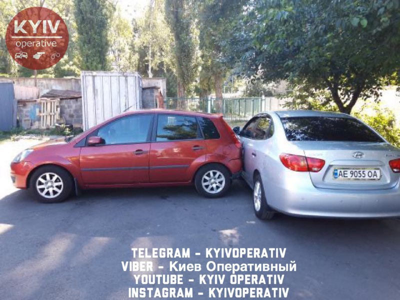 Инцидент произошел в районе станции метро "Шулявская". Водитель автомобиля марки Ford припарковал машину на парковке. Однако он забыл затянуть ручник. В результате машина покатилась назад.